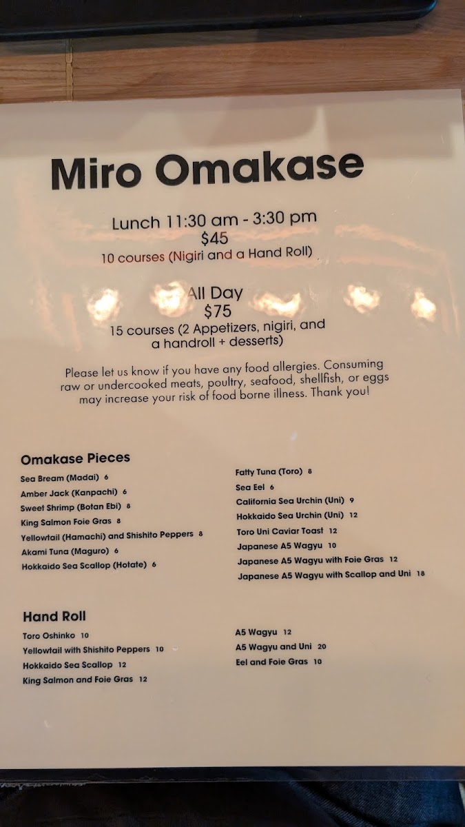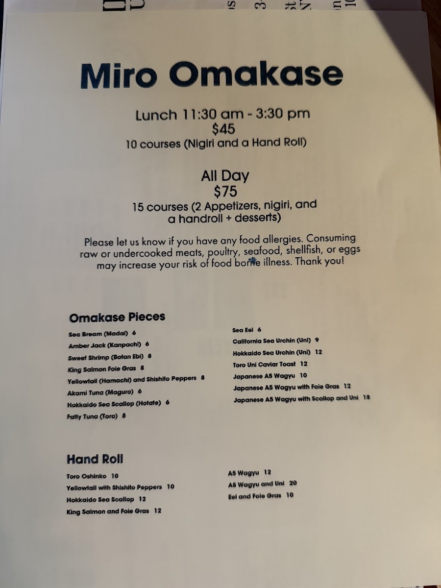 So happy to tried Miro tonight. The sashimi is so fresh and I have to recommend their signature Miro roll. The toro they use just melted in my mouth. The manager Nancy was so nice and so accommodating. My in-laws tried the wagyu roll and said it was so different from the other sushi restaurants.
